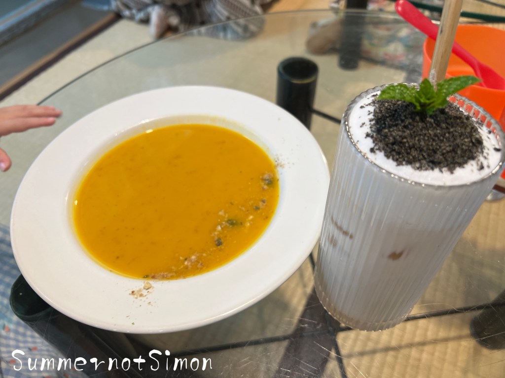 先說飲品: 南瓜濃湯、超級黑芝麻拿鐵、紅茶無糖
